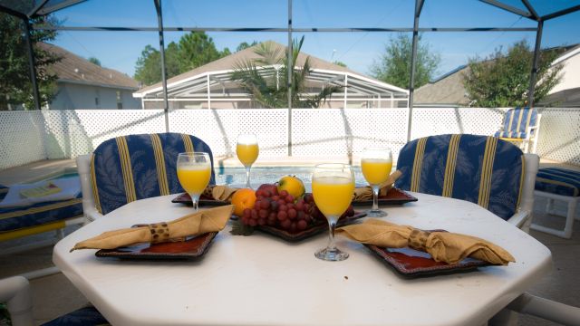 Leading outside to the pool area there is an enclosed patio area with table and 4 chairs. Then beyond